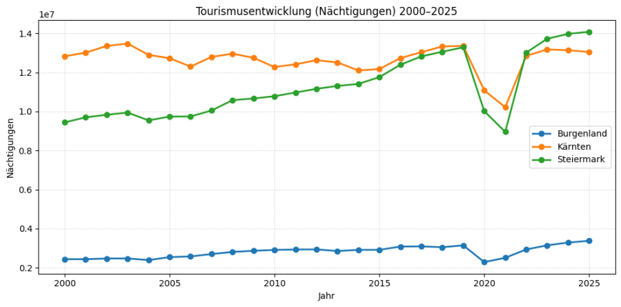 Im Vergleich zu Tirol, Salzburg, Wien und der Steiermark nimmt Kärnten eine stabile, aber strukturell andere Position ein. Während Tirol und Salzburg mit deutlich höheren Nächtigungszahlen die stärksten Tourismusregionen darstellen und stark vom internationalen Wintertourismus profitieren, bewegt sich Kärnten auf einem mittleren Niveau. Die Steiermark liegt in einer ähnlichen Größenordnung, verzeichnet jedoch in den letzten Jahren etwas dynamischere Zuwächse.